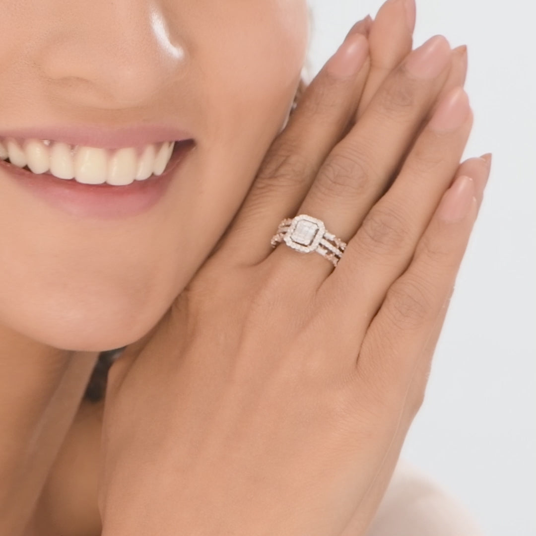 A powerful natural diamond ring featuring a dramatic layered, wide band centered on a rectangle-cut diamond cluster halo. Cascading baguette diamonds create a bold, geometric step design. Wear this stunning cocktail ring to a formal gala or anniversary dinner for undeniable vintage-modern luxury.