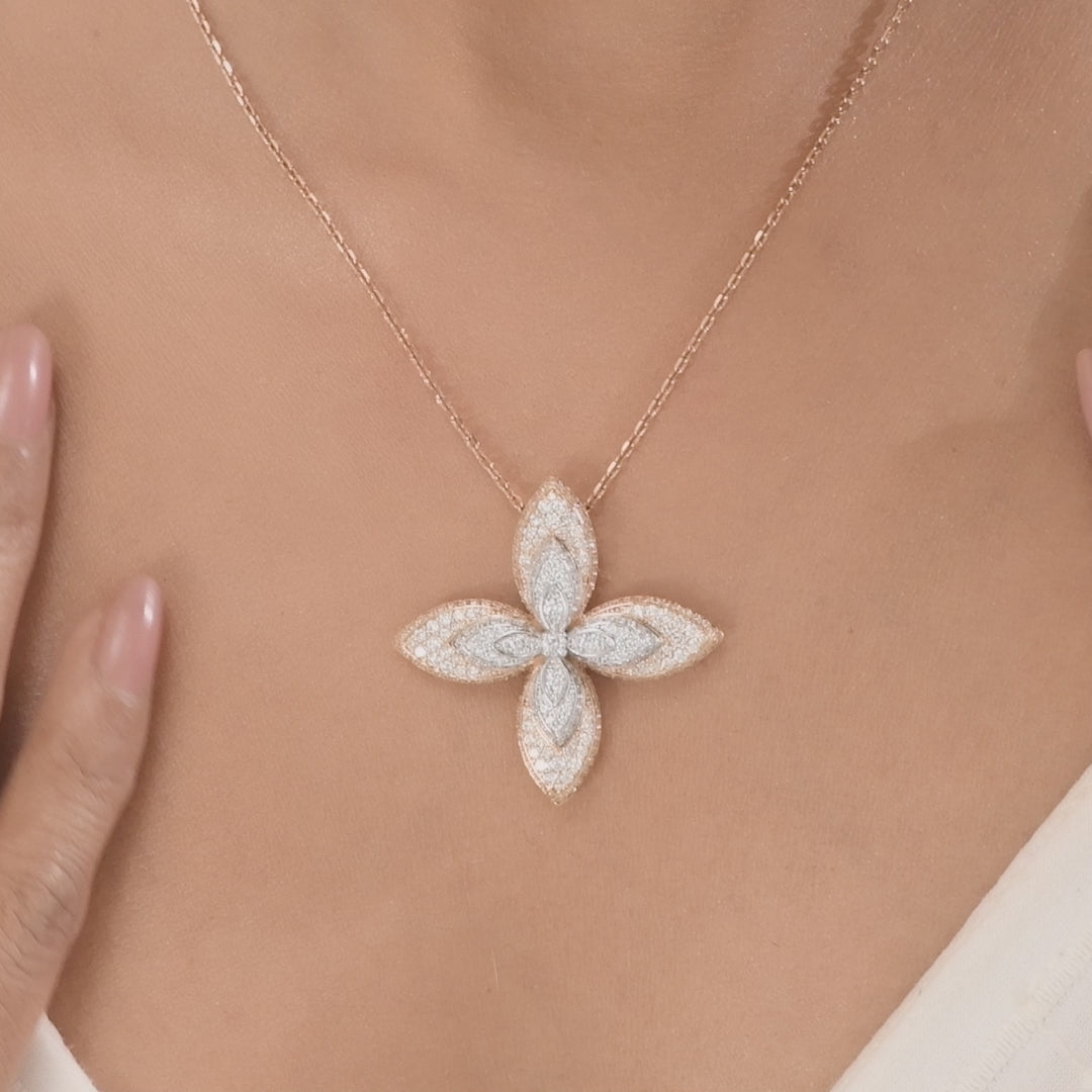 A stunning four-petal floral pendant featuring a symmetrical marquise-shaped design, intricately layered with pavé-set round white stones. The center cluster enhances its radiant brilliance, creating a graceful and dimensional look. Perfect for weddings, festive celebrations, cocktail evenings, and elegant party wear.