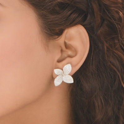 These elegant earrings feature a four-petal floral design beautifully encrusted with shimmering white stones, creating a radiant and refined look. Ideal for weddings, festive celebrations, or evening occasions, they bring a graceful sparkle to any outfit.