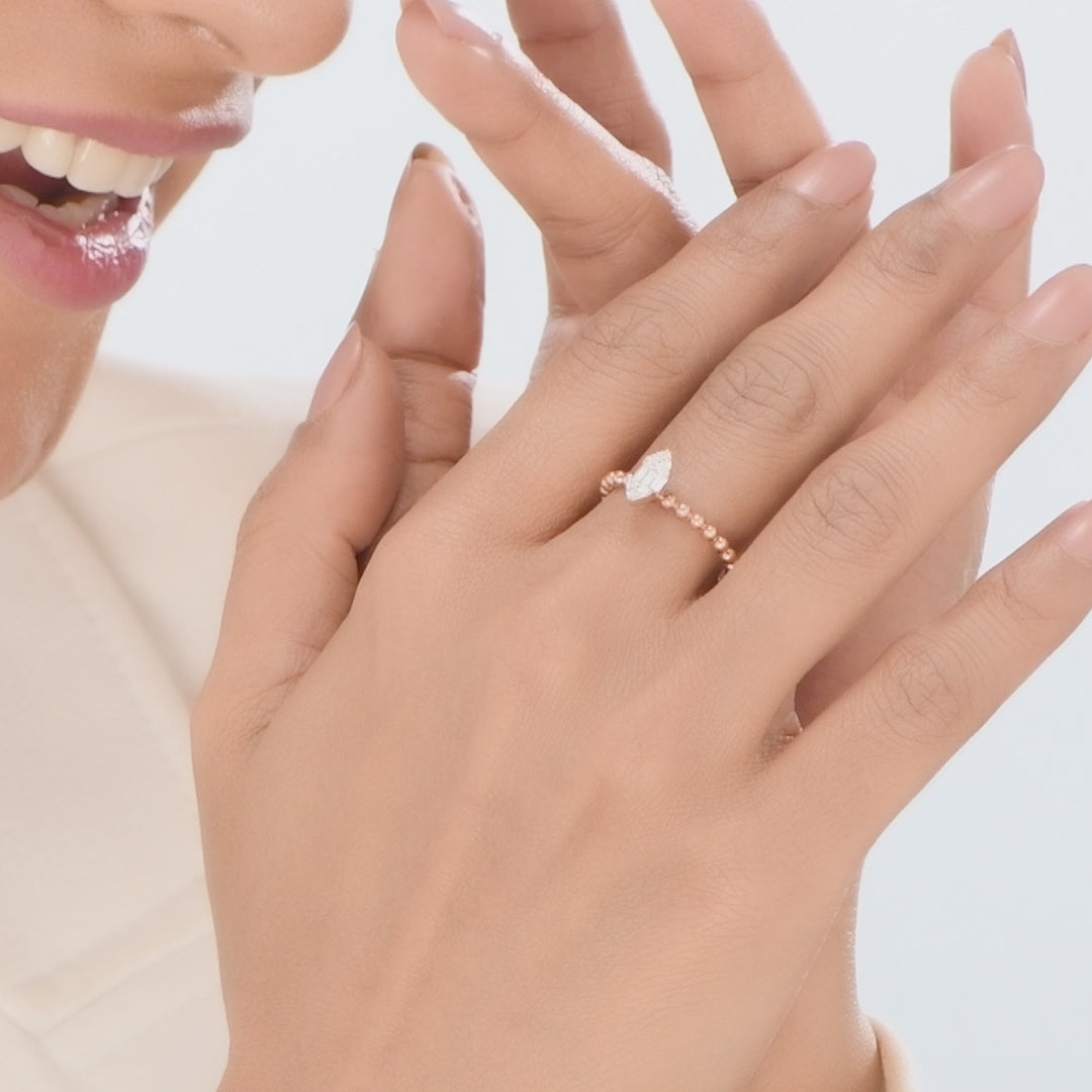 This stylish rose gold ring features a unique half-beaded and half-polished band. The vibrant, marquise-shaped design at the center is adorned with a mix of dazzling baguette and round diamonds. This elegant piece is perfect for adding a touch of bold sophistication to your everyday look or for wearing to a special occasion.