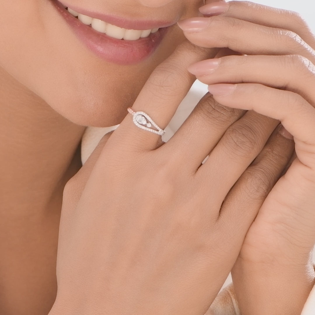 This eye-catching rose gold ring features a unique half-beaded and half-polished band. The centerpiece is a vibrant, swirling design with a central cluster of baguette and round diamonds surrounded by a flowing line of pave diamonds. This stunning and modern ring is perfect for special occasions or for adding a touch of bold sophistication to your everyday look.