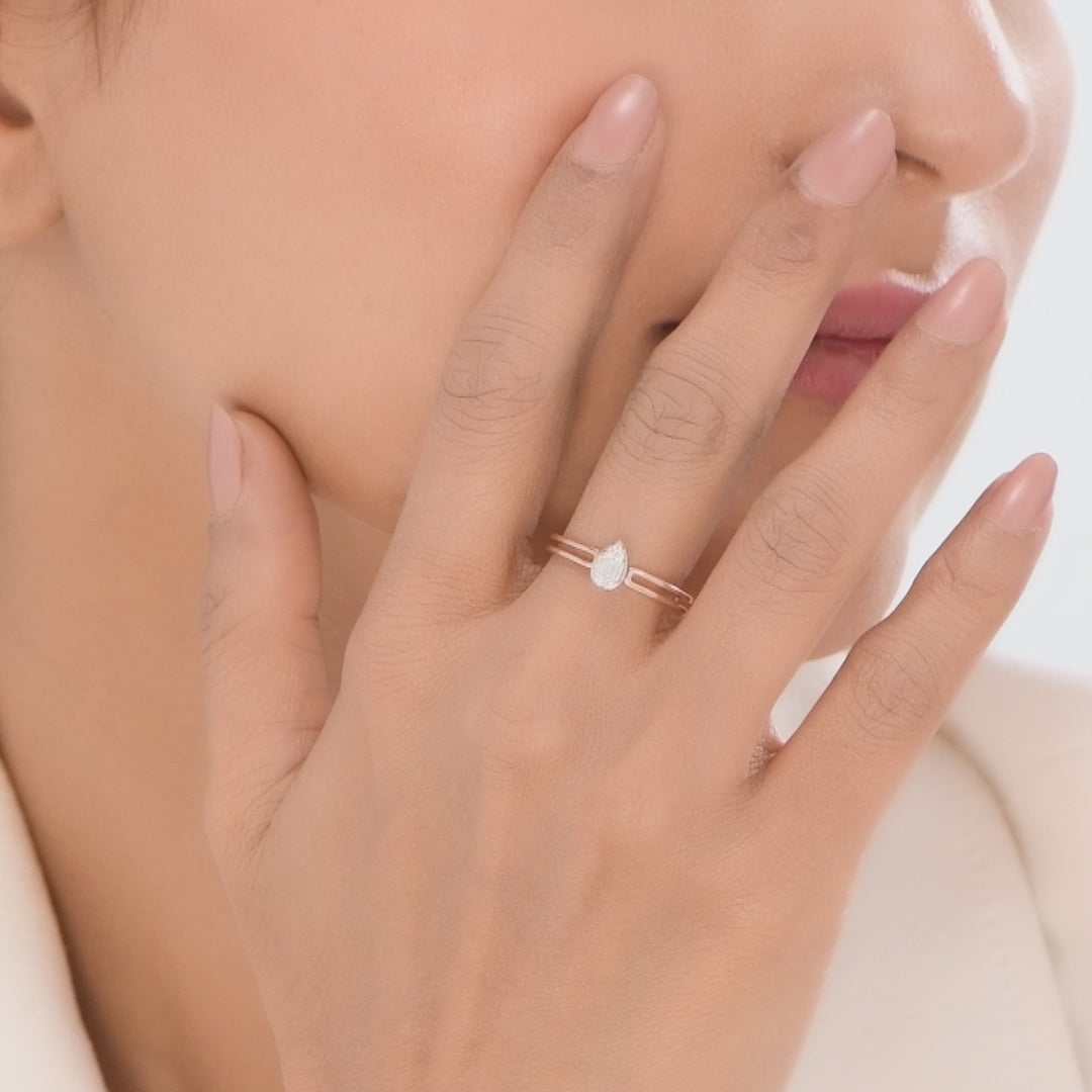 This stylish rose gold split-shank ring features a vibrant, teardrop-shaped diamond cluster at its center. This modern and unique piece is perfect for adding a touch of sophisticated sparkle to your everyday look or for a special occasion.