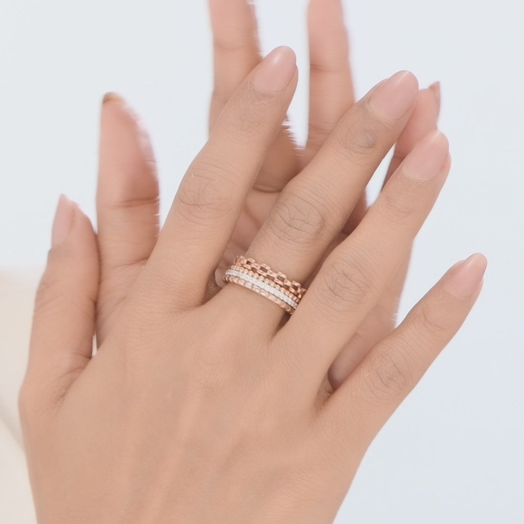 Make a vibrant statement with this unique rose gold multi-band ring. It features a captivating design that combines distinct textures: a modern watchband-style link, a dazzling diamond pave stripe, and a chic beaded band. This eye-catching piece is perfect for adding a touch of bold elegance to special occasions or elevating your everyday fashion.