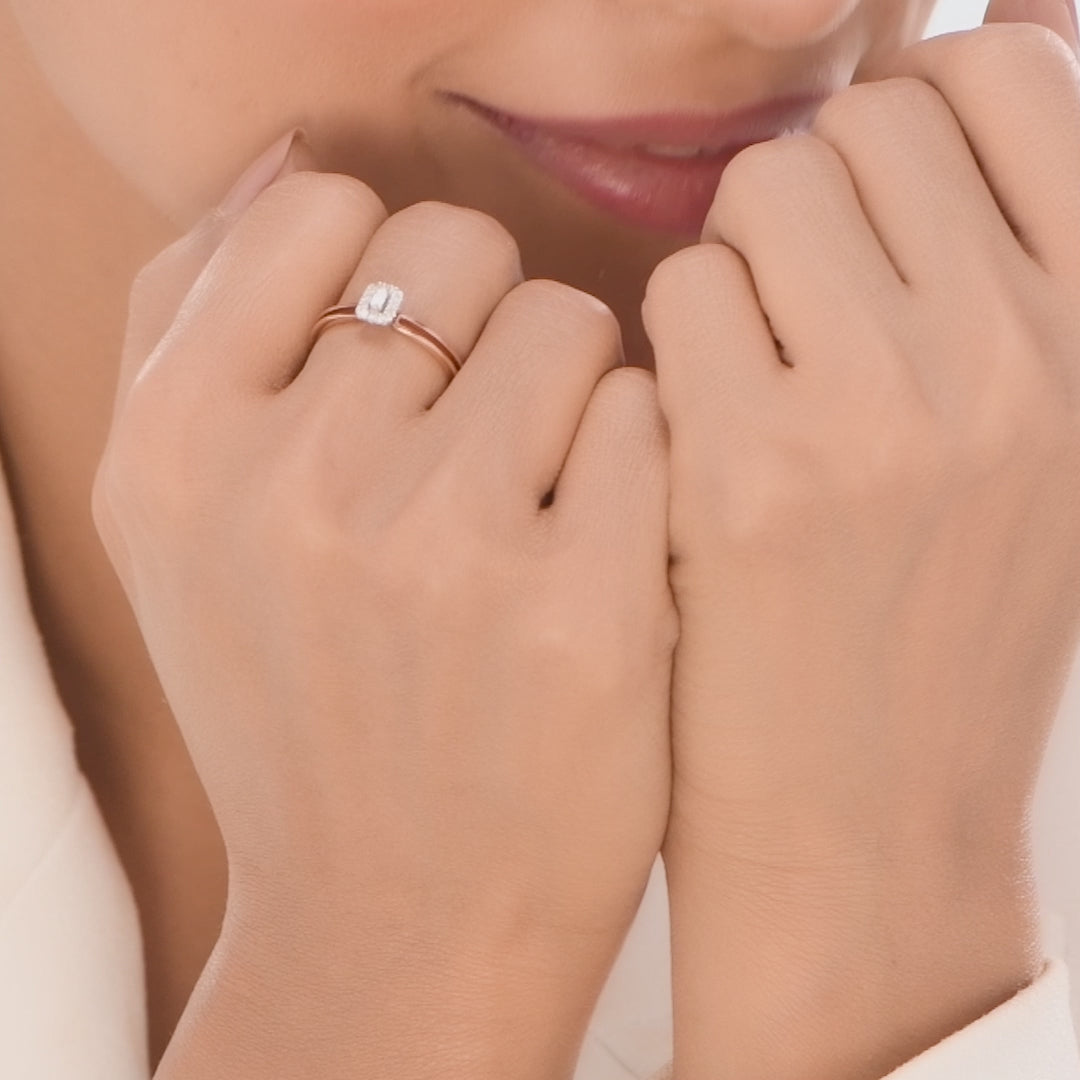 This striking rose gold split-shank ring features a vibrant, rectangular diamond cluster at its center, with a brilliant baguette diamond surrounded by a shimmering halo of round diamonds. The modern design is perfect for adding a touch of bold elegance to your everyday look or for a special occasion.