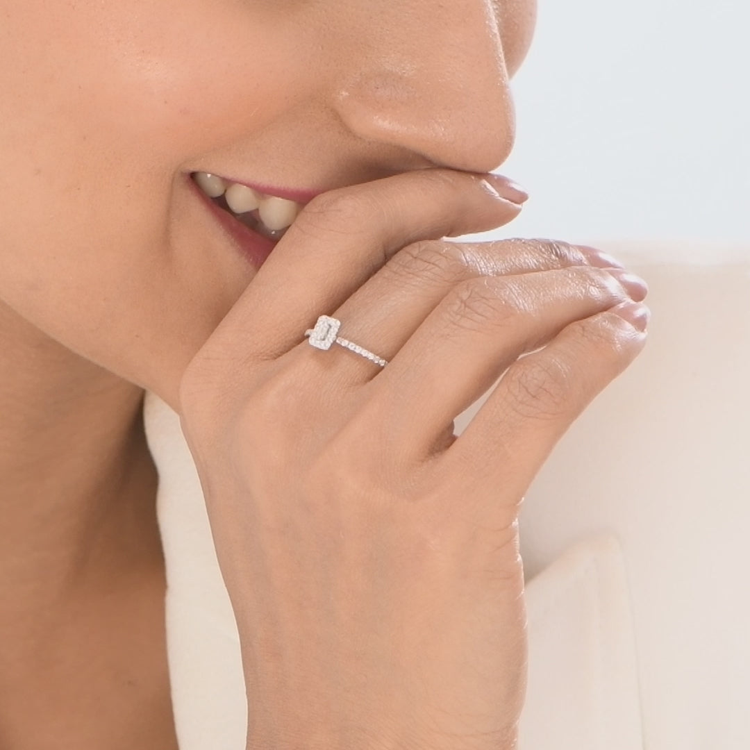 This elegant white gold ring features a vibrant, rectangular diamond cluster at its center, with a brilliant baguette diamond surrounded by a shimmering halo of round pave diamonds. Its striking and modern design makes it perfect for special occasions or for adding a touch of sophisticated glamour to your everyday style.