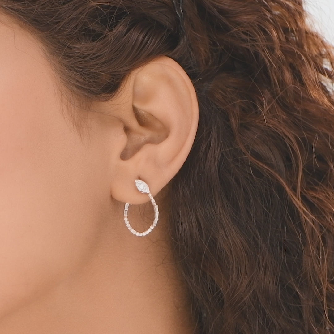 These striking earrings feature a luminous, elongated cluster of brilliant precious stones that anchors a gracefully curving arc of sparkle. They are an elegant choice for cocktail receptions, a stylish dinner party, or adding refined glamour to any evening event.