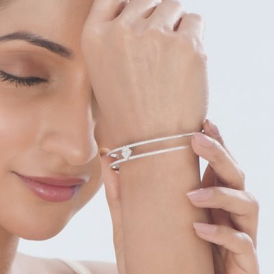 This double-band cuff design features open ends secured by a safety chain. The two bands are paved with colorless diamonds and connected by a small, elevated four-petal cluster of baguette and brilliant-cut diamonds. This versatile piece is perfect for cocktail receptions, business luncheons, or elevated daily wear.