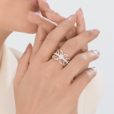 This bold Natural Diamond Ring features a wide, mixed-metal openwork design. A brilliant central round diamond cluster is framed by sweeping, pave-set bands, forming a luxurious bow or butterfly silhouette. The ultimate cocktail ring or milestone anniversary gift.