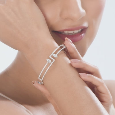 This split-bangle has a sharp, geometric Z-shape design. It is fully set with colorless diamonds in a double-row pave, highlighted by two marquise-shaped clusters of baguette diamonds. It is perfect for gallery openings, business dinners, or high-end professional events.