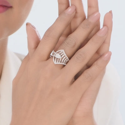 This magnificent Natural Diamond Ring is a wide statement piece with a captivating mixed-metal openwork design. The elongated, marquise-like shape features a central round diamond cluster framed by sweeping, pave-set bands. It is the perfect luxury cocktail ring or milestone anniversary gift for a grand special occasion.