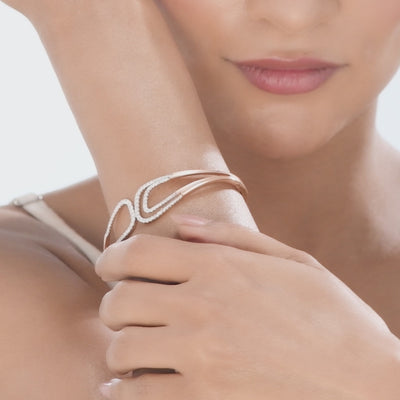 This bracelet has a fixed bangle shape with a hinge, featuring an open, abstract hourglass or ribbon design. The curved outlines are paved with colorless diamonds. This elegant, contemporary piece is perfect for high-end cocktail parties, wedding guest attire, or museum openings.