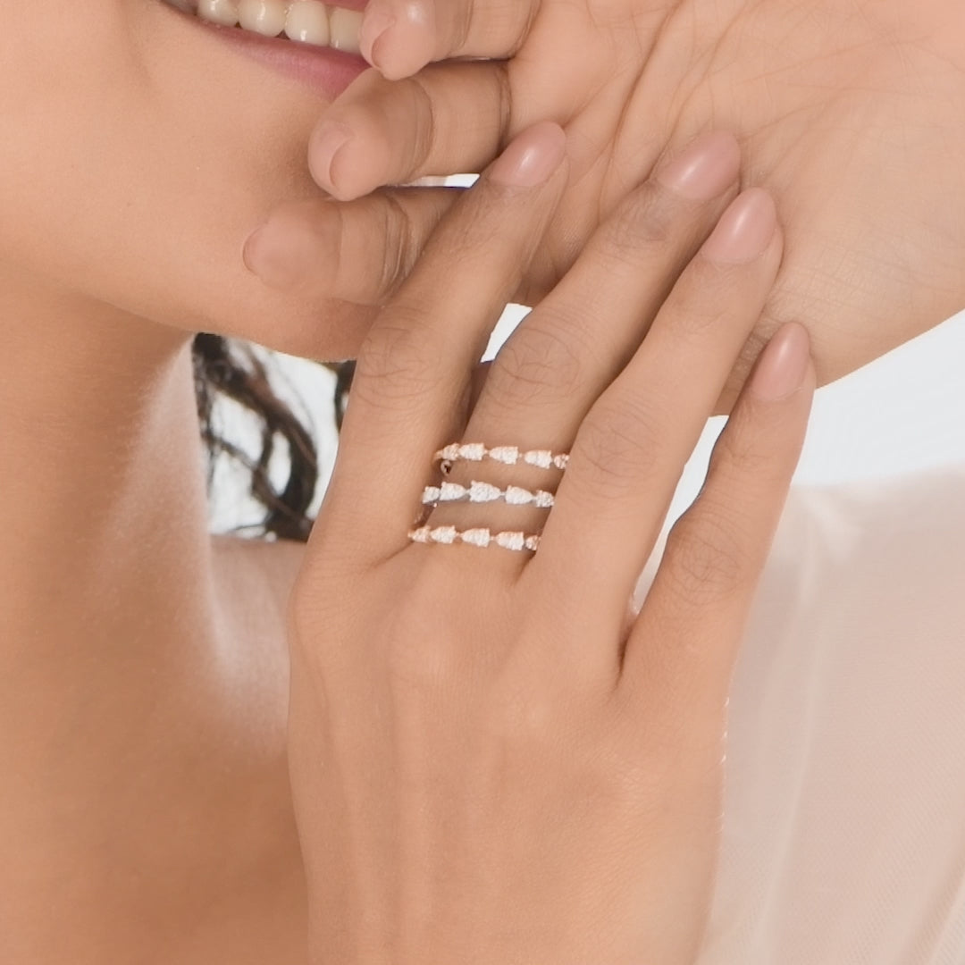 This contemporary Natural Diamond Ring features a chic open band design, expertly crafted in a mixed-metal look. The style gives the illusion of three stacked rings. Each band is set with dazzling, graduating round diamond clusters arranged in a captivating wave or zig-zag pattern. It's a perfect choice for a modern anniversary band, a unique wedding stack accent, or stylish everyday fine jewelry.