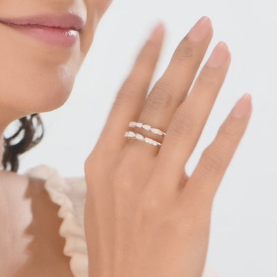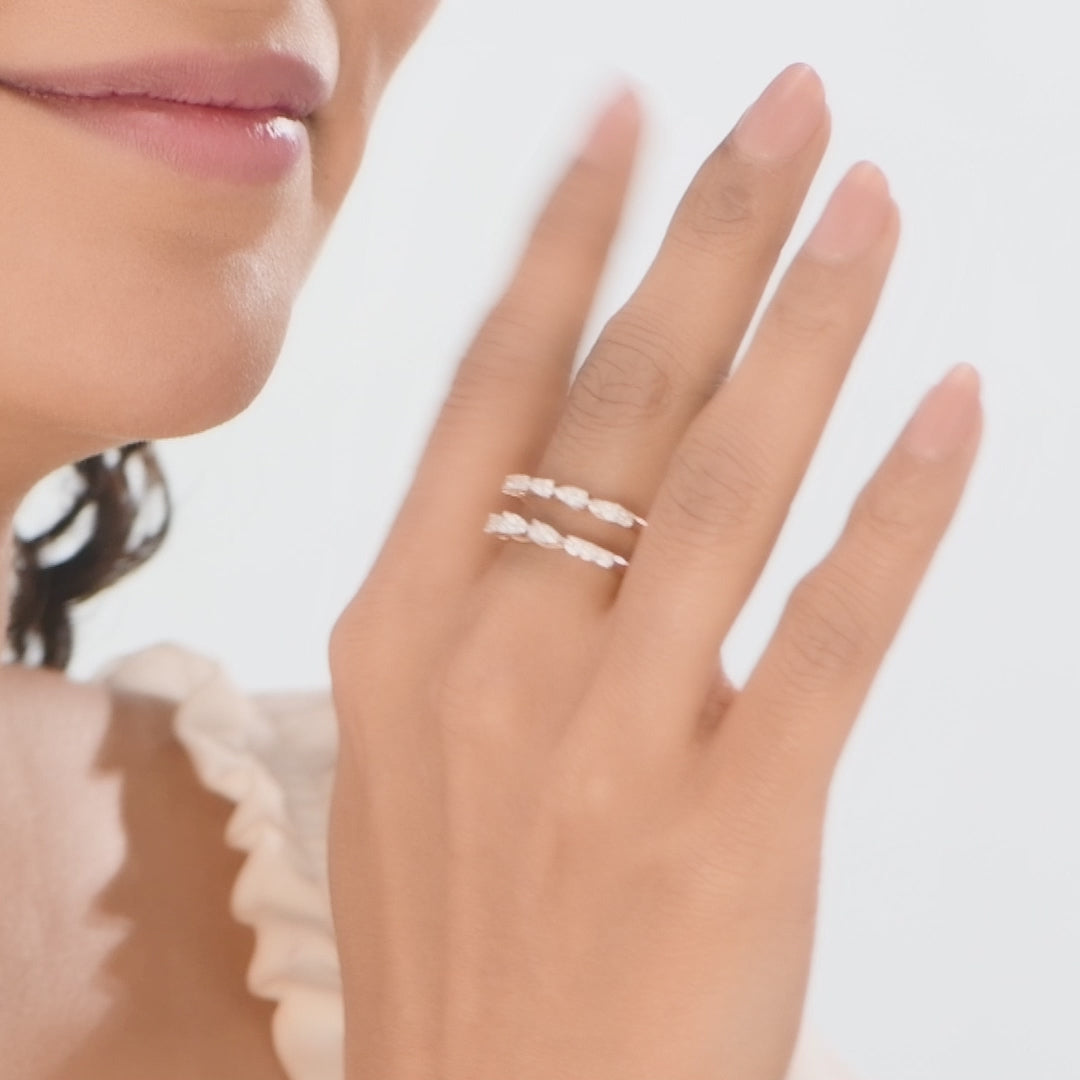 This chic Natural Diamond Ring has an open band and contour design with two parallel rows of shimmering marquise diamond clusters, creating a continuous petal pattern. Perfect as a luxurious bridal ring enhancer, romantic anniversary gift, or sophisticated stackable band.