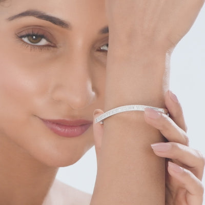 This flexible bangle boasts a magnificent curved, double-row design. The center features striking baguette-cut diamonds, perfectly outlined by rows of glittering round-cut diamonds. The pure white diamond brilliance makes it a supreme statement piece for black-tie events or a memorable anniversary celebration.