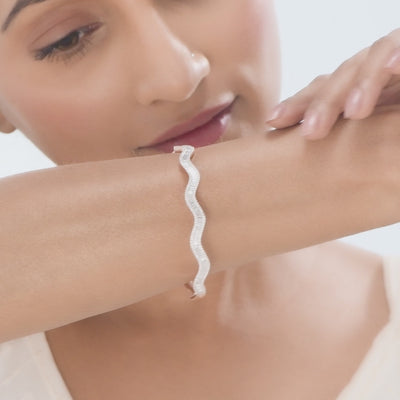 This wavy bangle features a dynamic design where one half is entirely set with baguette and brilliant-cut diamonds. The only colored stones are colorless diamonds. It is a modern, elegant statement piece perfect for sophisticated business attire or fashion-forward dinner events.