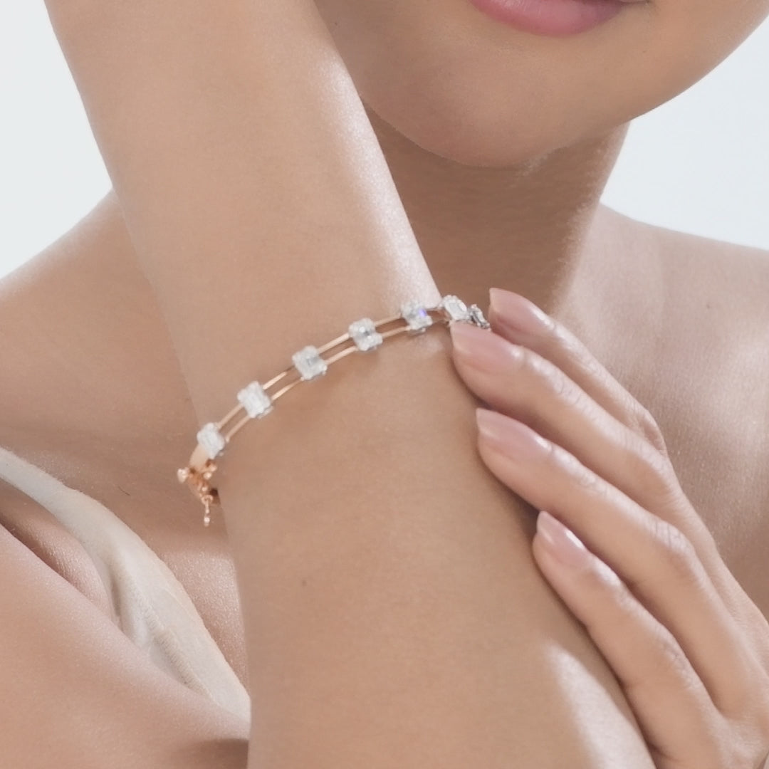 This sleek bangle showcases a minimalist, dual-rail design. The focus is on stunning, vertically set baguette-cut diamonds, clustered into distinct, geometric segments. The white sparkle of the diamonds makes this piece perfect for cocktail events or elevating your daily business-chic style.