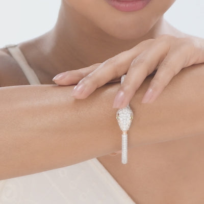 This striking serpent-shaped bangle bracelet is fully paved with brilliant-cut diamonds. The intricate design culminates in a snake's head with mesmerizing green colored stones for eyes. It is the perfect bold statement piece for gala dinners, cocktail parties, or any sophisticated evening occasion.