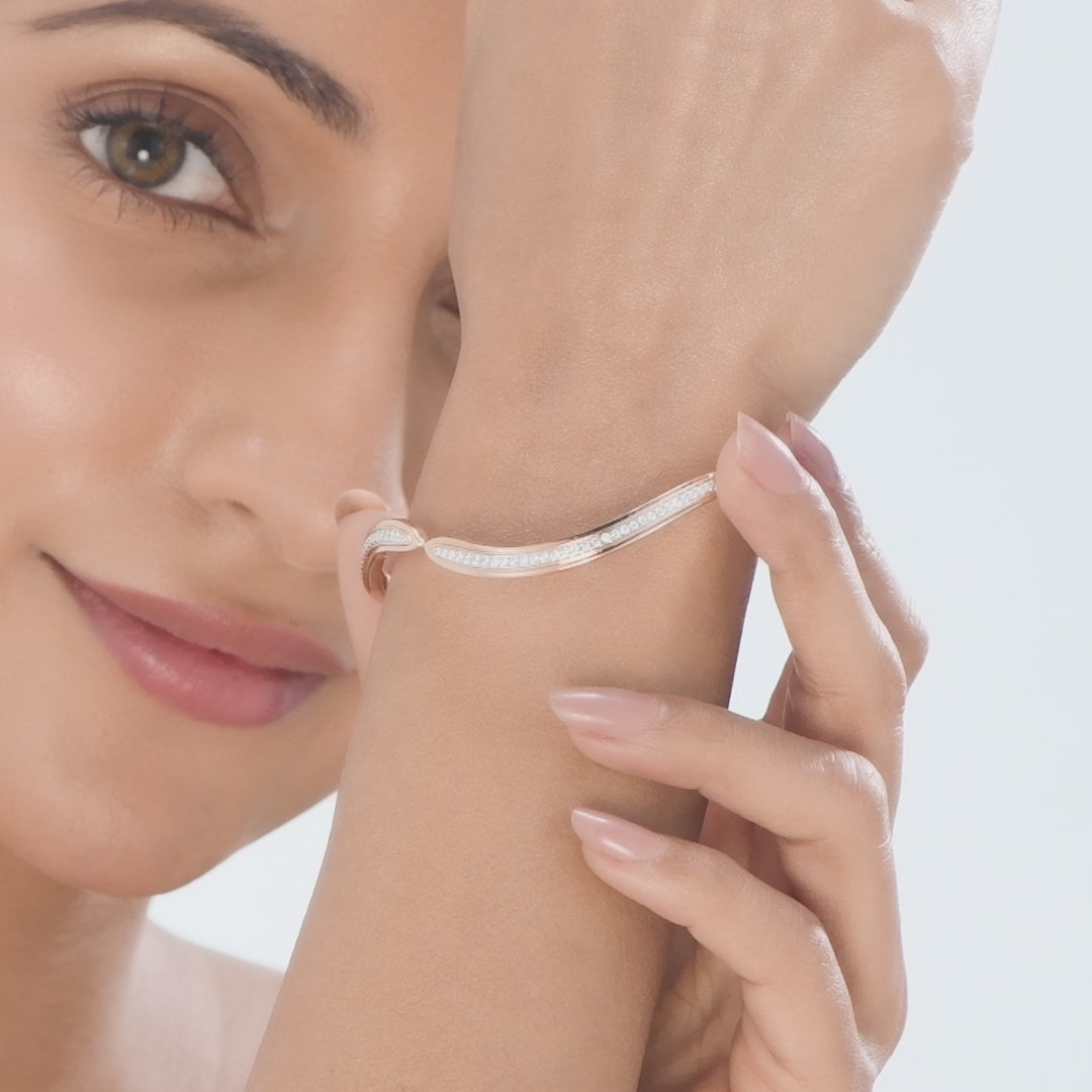 This open-style bangle features two leaf-shaped contours in a rosy-toned metal, each paved with brilliant round diamonds. It's an elegant accessory, perfect for sophisticated office wear or a special business dinner.