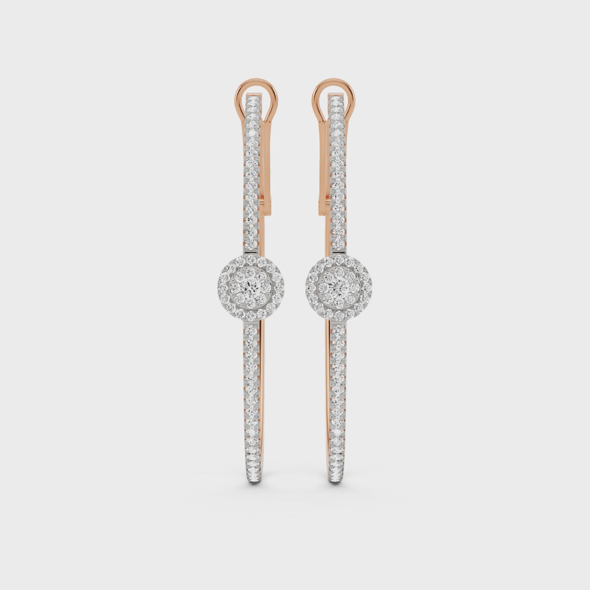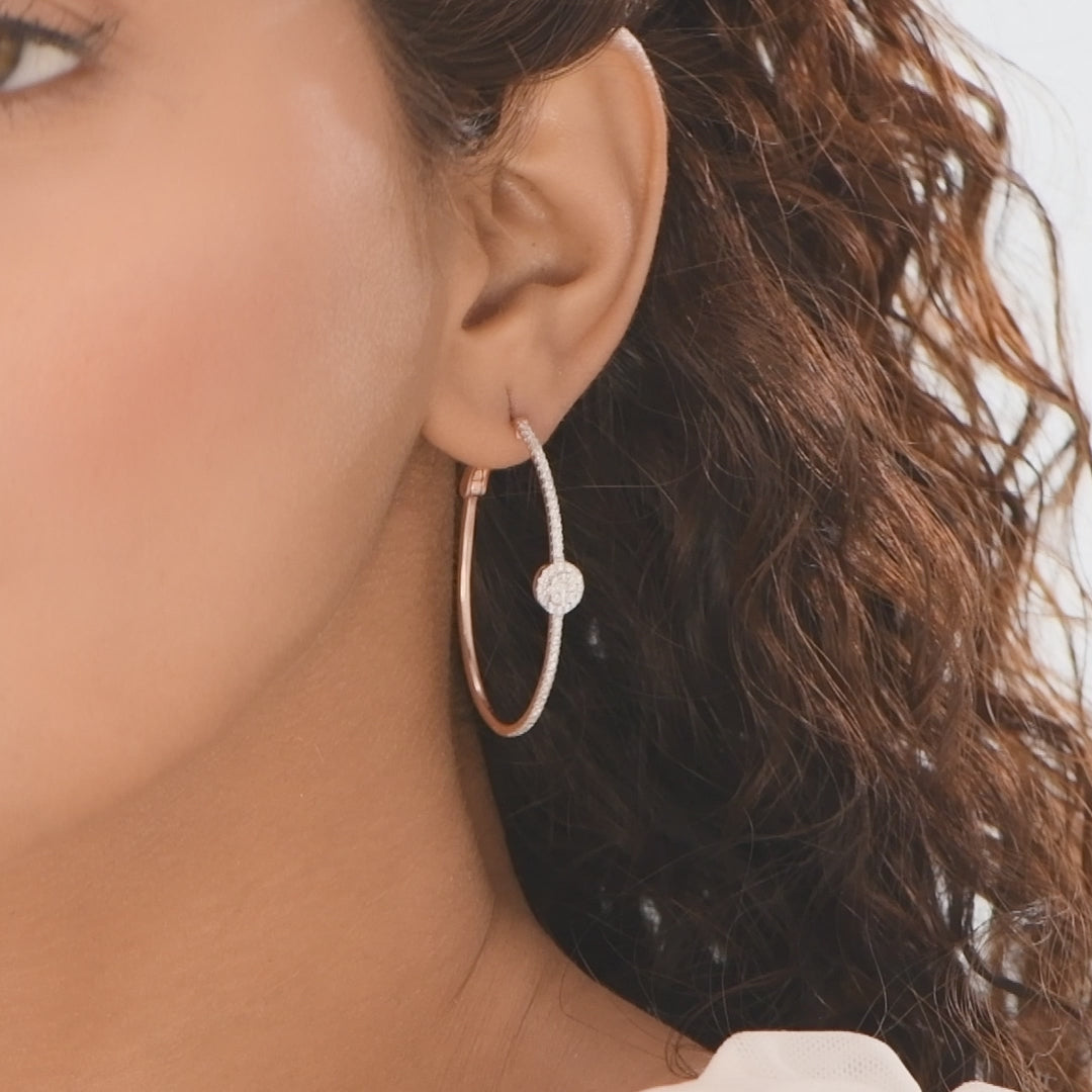 A bold yet sophisticated statement from the Sassy Collection, these rose gold hoops set in 14KT gold with a total weight of 5.330 (5.210 grams net) feature a striking round pavé-set horizontal baguette motif at the centre. With 120 natural diamonds and a total diamond weight of 0.600 carats, these earrings are perfect way to elevate any ensemble.