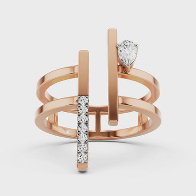 A modern statement of elegance, this 14KT rose gold ring from the Seven Up collection features a sleek, abstract design adorned with 9 natural diamonds, totaling 0.126 carats. Crafted for effortless sophistication, it has a gross weight of 1.850 grams and a net weight of 1.825 grams, making it a refined yet striking addition to any fine jewellery collection.