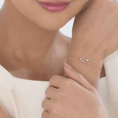 The Seven Up Collection's elongated rectangular bracelets are crafted in rose gold and feature 9 natural diamonds weighing 0.06 carats with a gross weight of 1.56 grams and a net weight of 1.54 grams. With a sleek, modern design, they offer a refined, minimalist touch that complements both casual and evening wear, adding sophistication and elegance to any look.