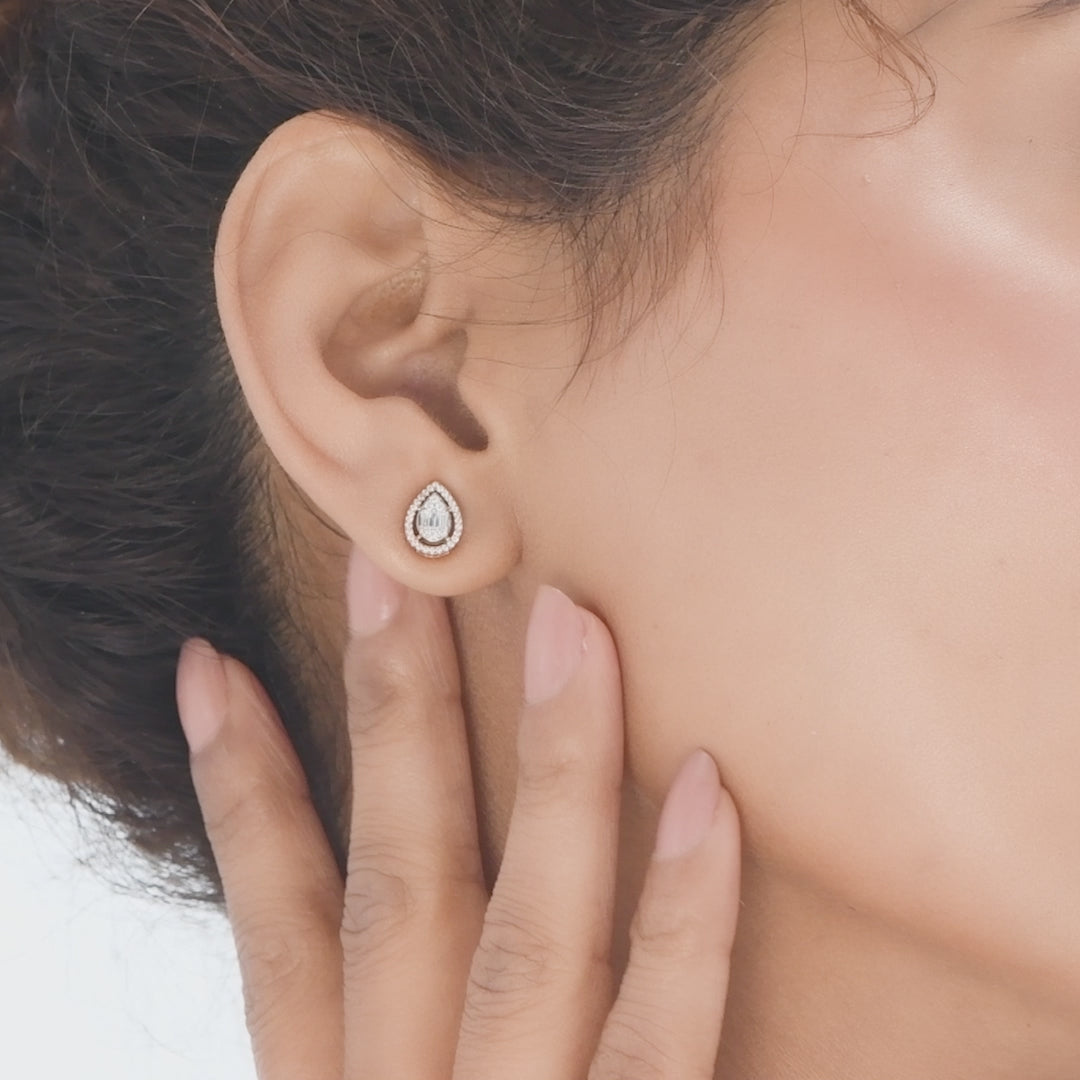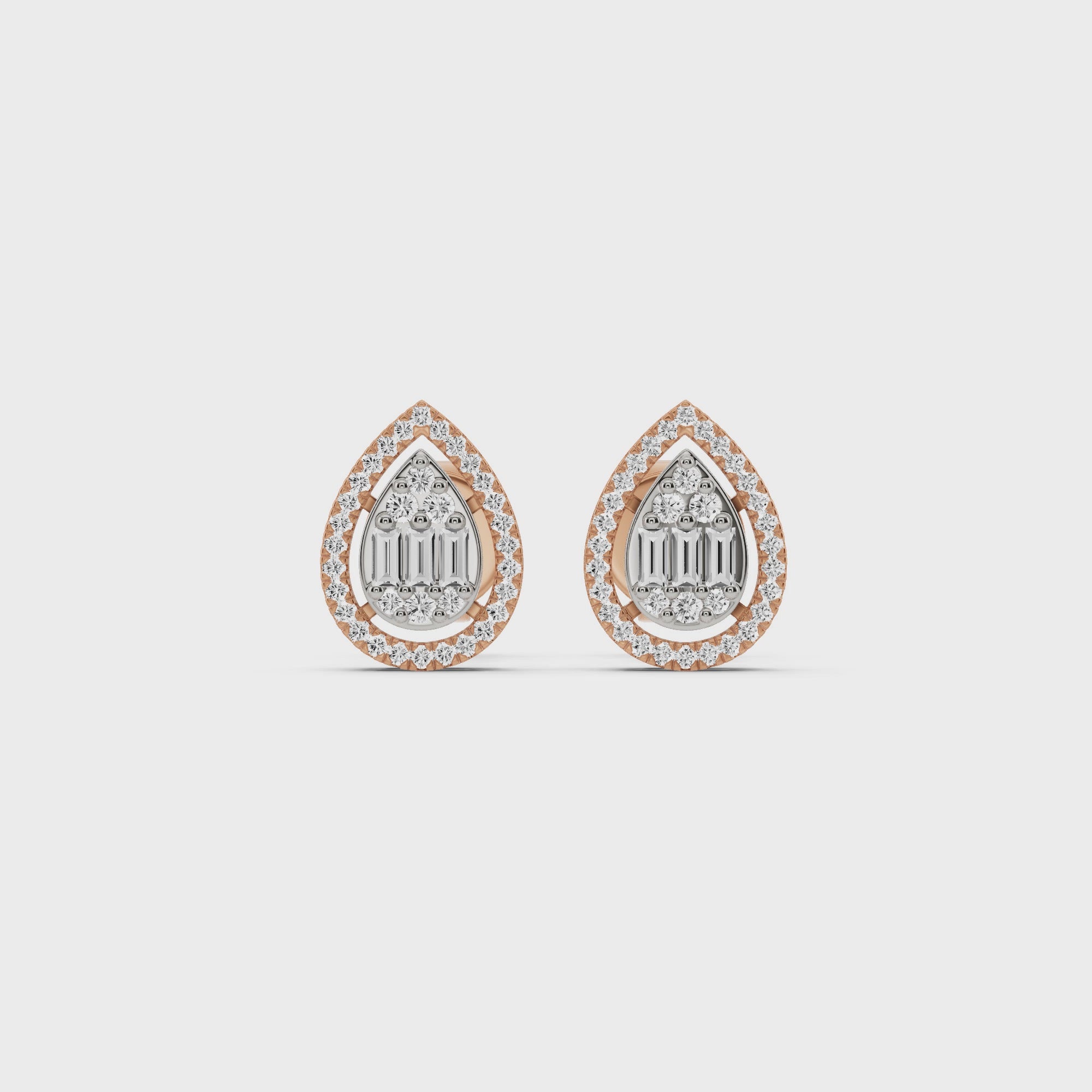 A pair of rose gold diamond earrings from the Facet Fusion Signature Collection, designed with a pavé-set drop solitaire, framed by meticulously placed natural diamonds for added brilliance where craftsmanship meets elegance. Set in refined 14KT gold with a total weight of 1.720 grams (1.678 grams net) and adorned with 76 natural diamonds (0.211 carats), these elegant earrings are perfect for evening wear.