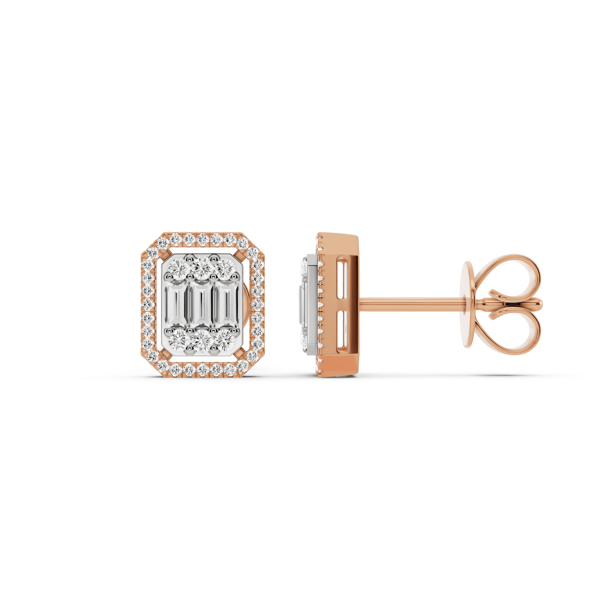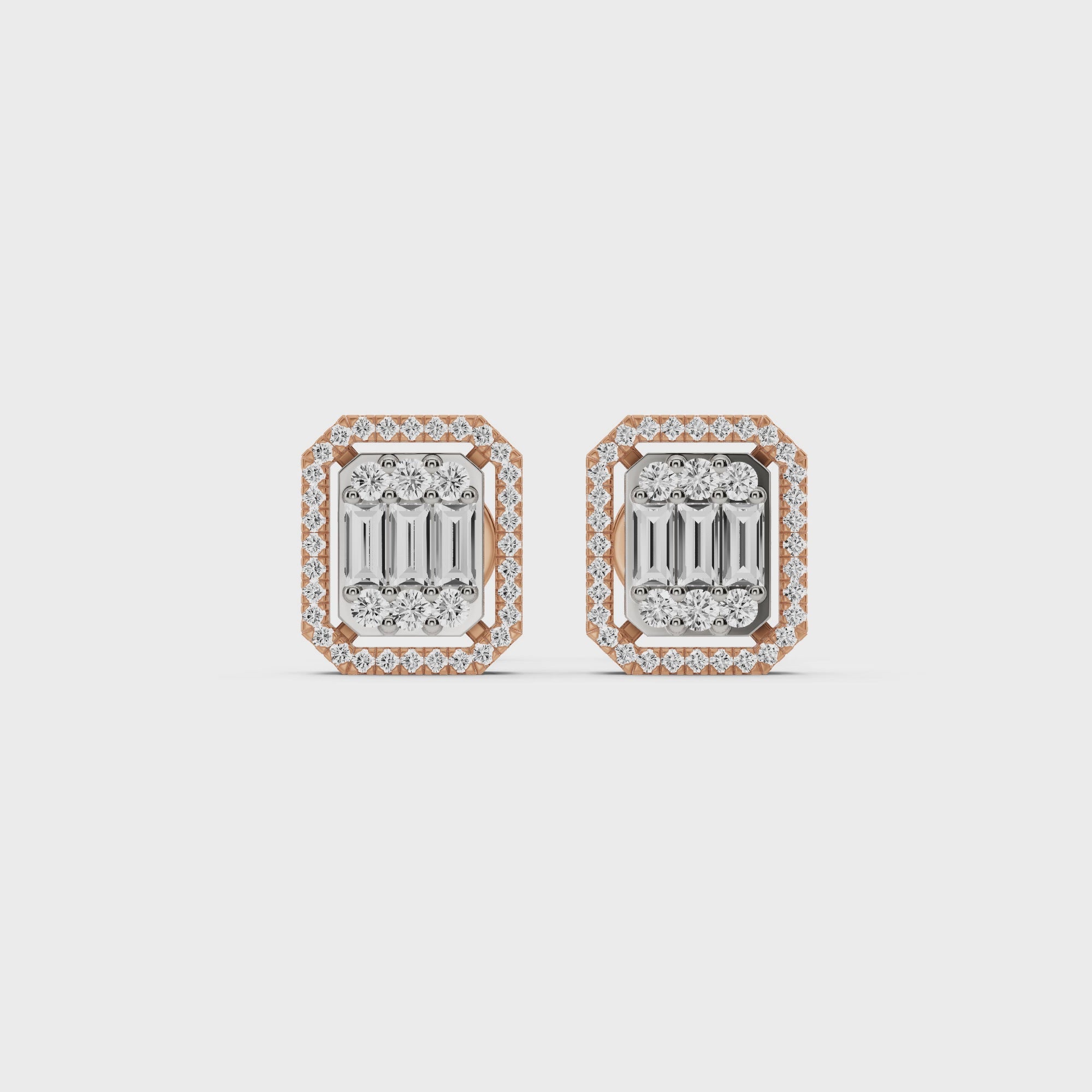 A pair of rose gold diamond earrings from the Facet Fusion Signature Collection, designed with a pavé-set emerald solitaire, framed by meticulously placed natural diamonds for added brilliance where craftsmanship meets elegance. Set in refined 14KT gold with a total weight of 2.060 grams (1.975 grams net) and adorned with 84 natural diamonds (0.424 carats), these elegant earrings are perfect for evening wear.