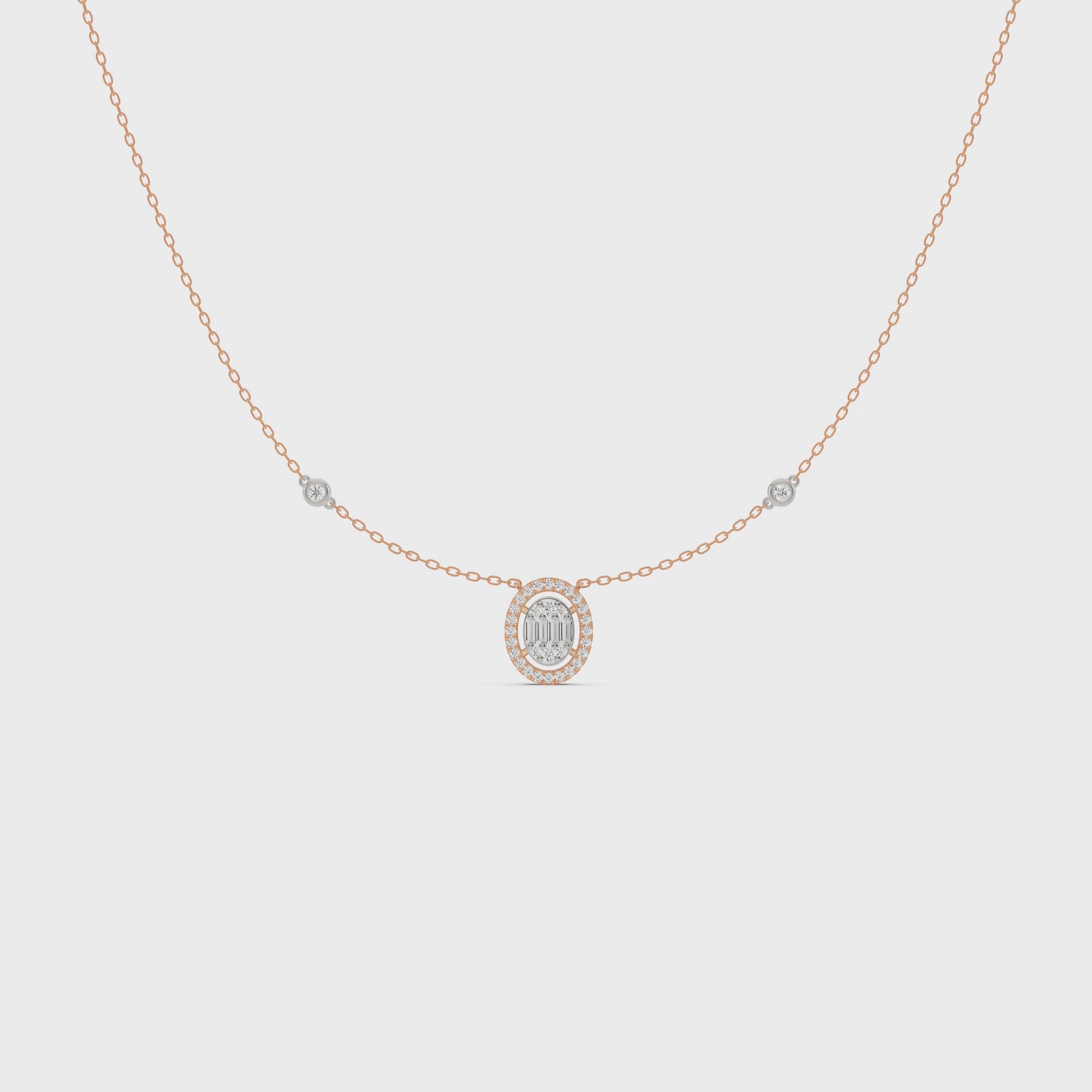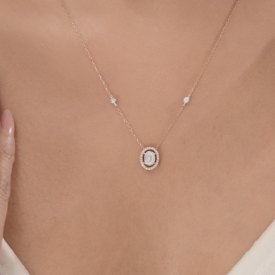 Rose gold diamond pendant from the Facet Fusion Signature Collection, designed with a pavé-set oval solitaire, framed by meticulously placed natural diamonds for added brilliance where craftsmanship meets elegance. Set in refined 14KT gold with a total weight of 1.610 grams (1.566 grams net) and adorned with 37 natural diamonds (0.218 carats), these elegant pendants are perfect for evening wear.