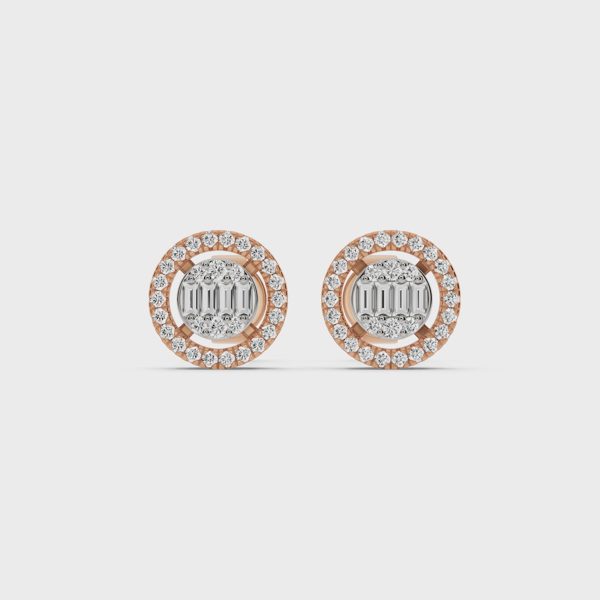 A pair of rose gold diamond earrings from the Facet Fusion Signature Collection, designed with a pavé-set round solitaire, framed by meticulously placed natural diamonds for added brilliance where craftsmanship meets elegance . Set in refined 14KT gold with a total weight of 1.980 grams (1.927 grams net) and adorned with 66 natural diamonds (0.265 carats), these elegant earrings are perfect for evening wear.