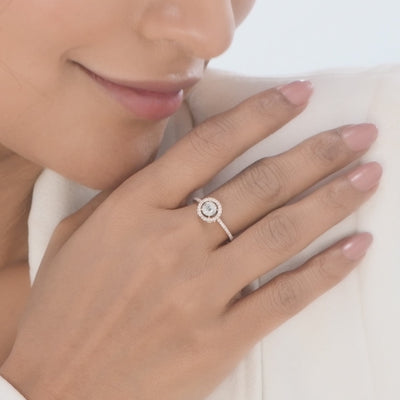 Rose gold diamond ring from the Facet Fusion Signature Collection, designed with a pave-set round solitaire, framed by meticulously placed natural diamonds for added brilliance where craftsmanship meets elegance.