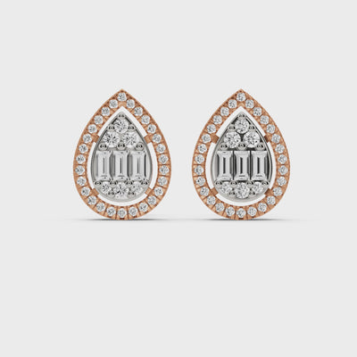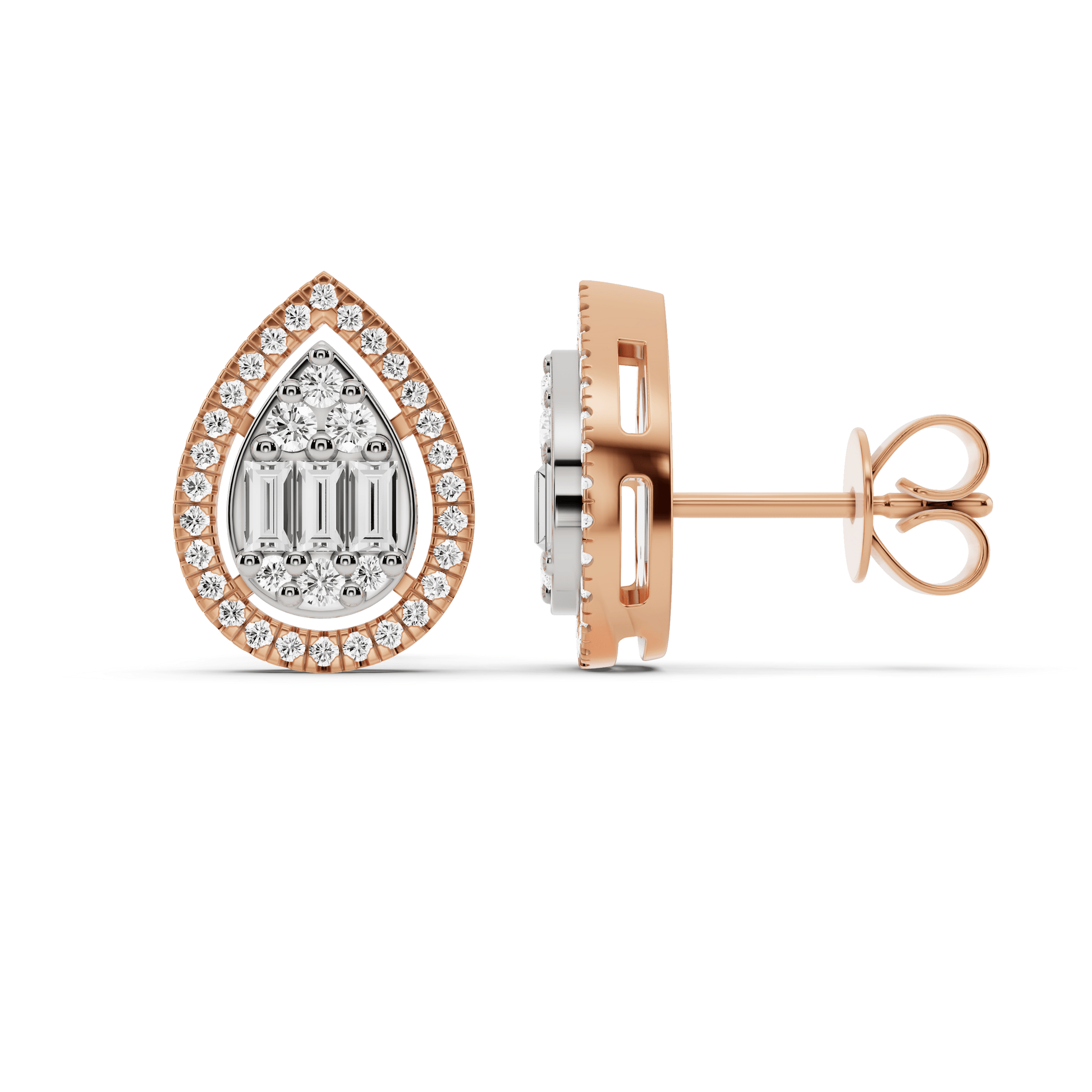 Rose gold diamond earrings from the Facet Fusion Signature Collection, designed with a pavé-set Drop solitaire, framed by meticulously placed natural diamonds for added brilliance where craftsmanship meets elegance. Set in refined 14KT gold with a total weight of 3.590 grams (3.468 grams net) and adorned with 76 natural diamonds (0.608 carats), these elegant ring are perfect for evening wear.