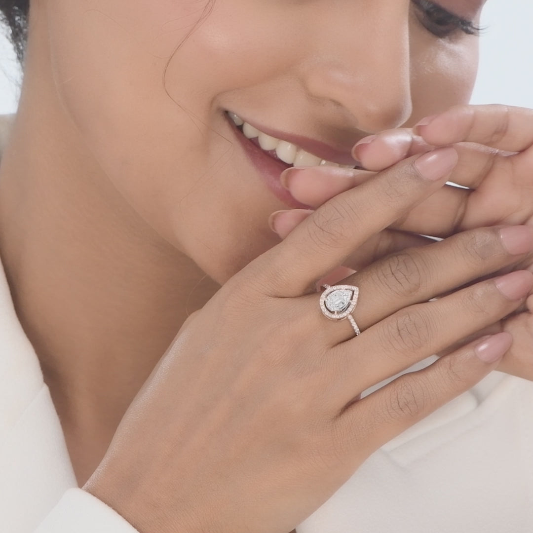 Rose gold diamond ring from the Facet Fusion Signature Collection, designed with a pave-set Drop solitaire, framed by meticulously placed natural diamonds for added brilliance where craftsmanship meets elegance.