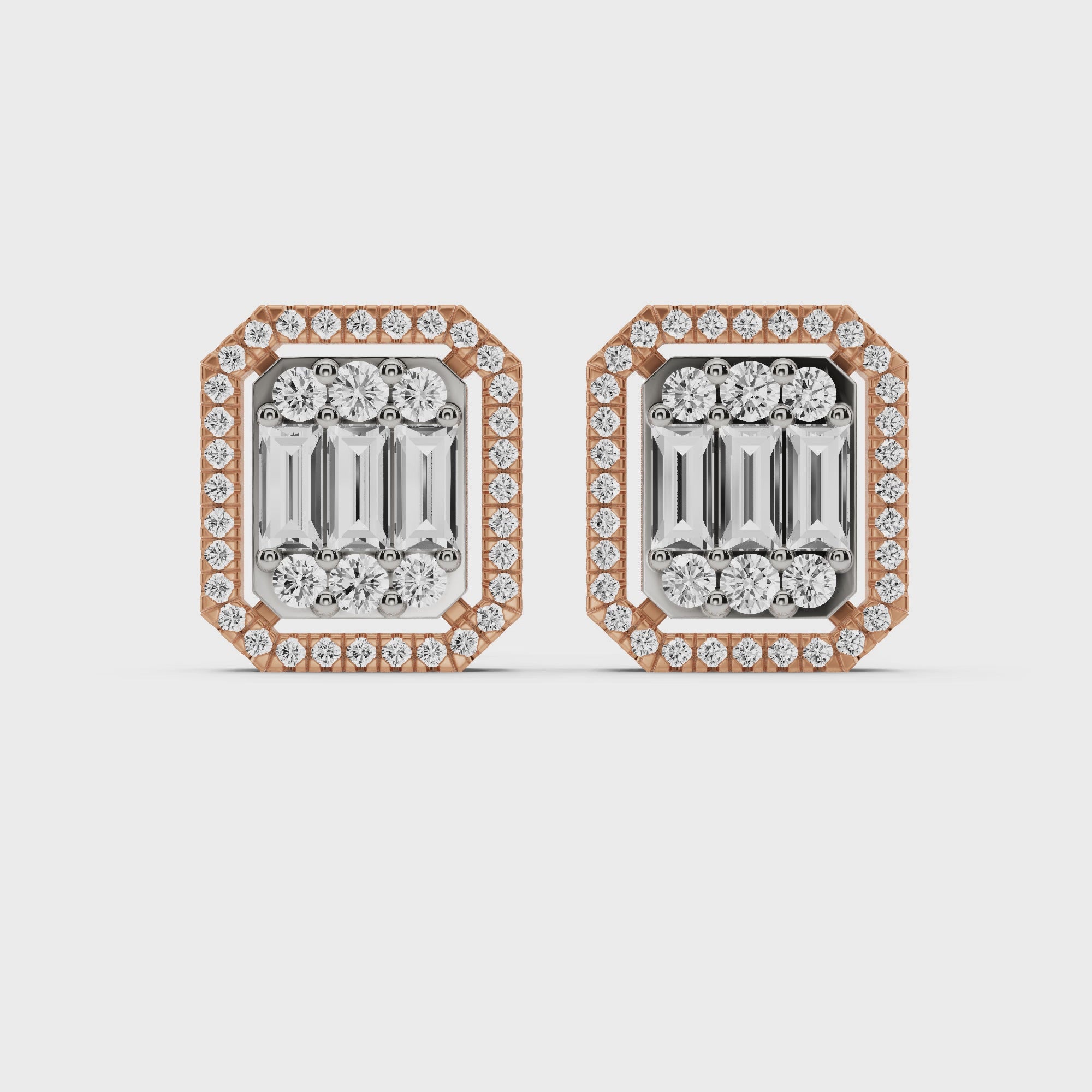 A pair of rose gold diamond earrings from the Facet Fusion Signature Collection, designed with a pavé-set emerald solitaire, framed by meticulously placed natural diamonds for added brilliance where craftsmanship meets elegance. Set in refined 14KT gold with a total weight of 4.06 grams (3.838 grams net) and adorned with 84 natural diamonds (1.110 carats), these elegant earrings are perfect for evening wear.