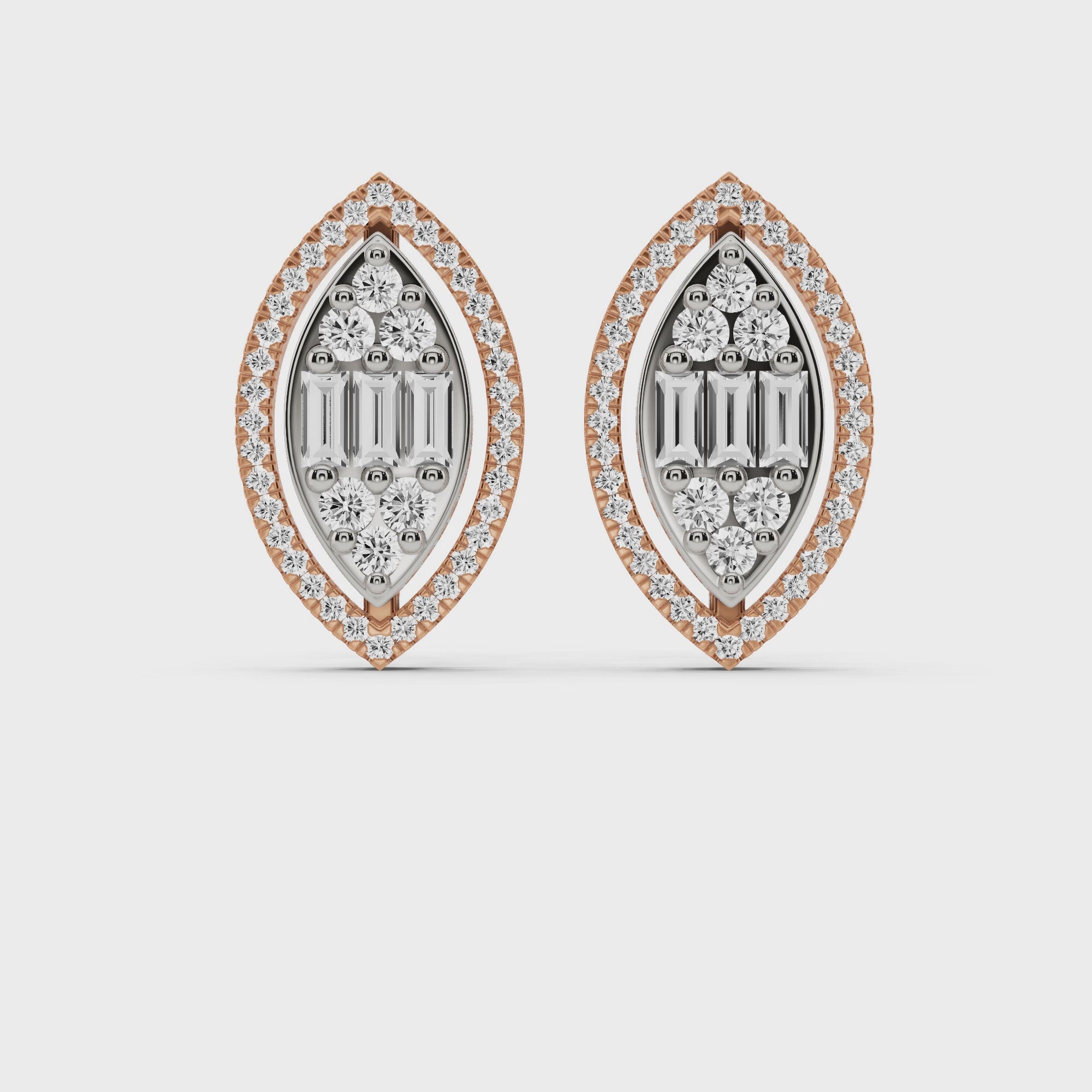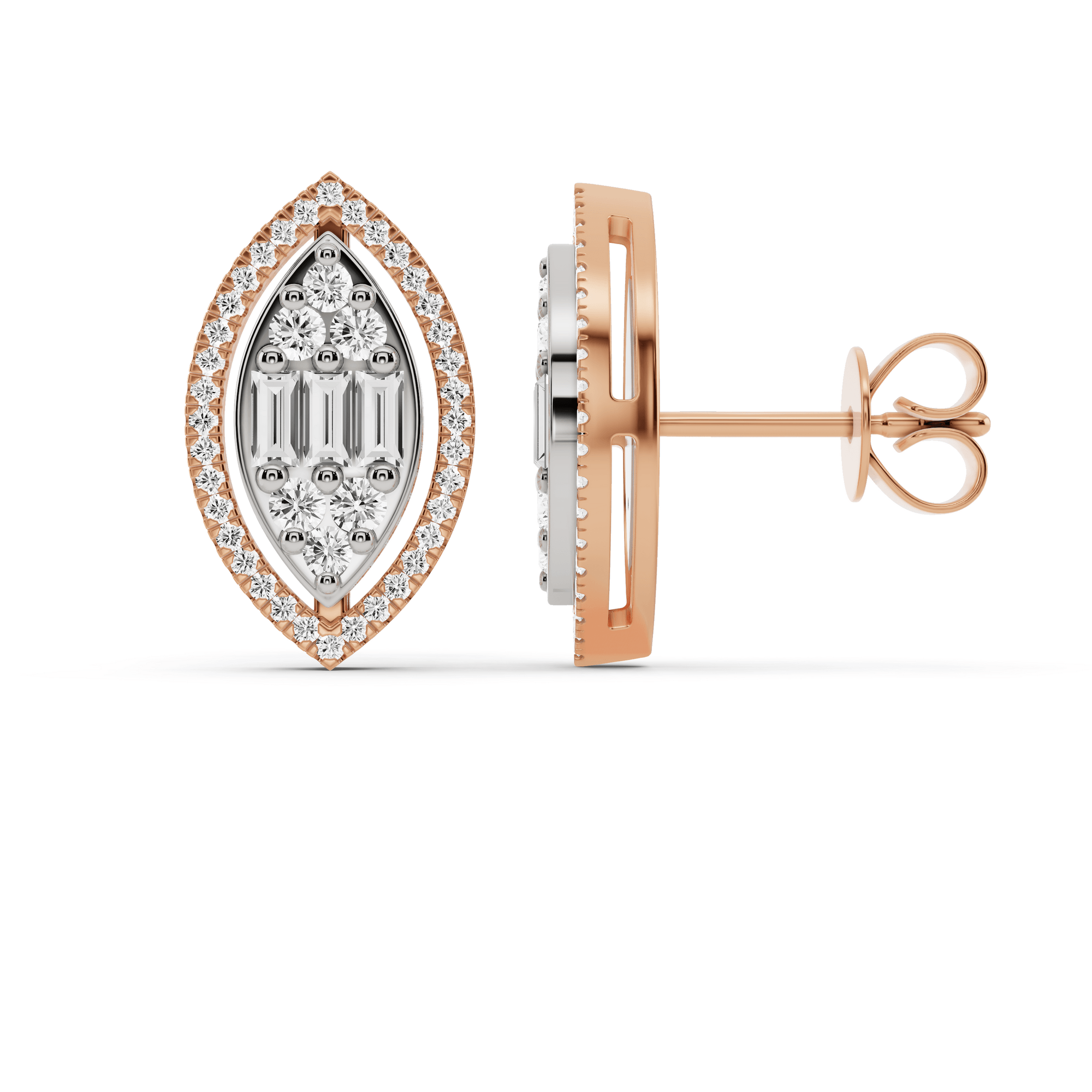 Rose gold diamond earring from the Facet Fusion Signature Collection, designed with a pavé-set Marquise solitaire, framed by meticulously placed natural diamonds for added brilliance where craftsmanship meets elegance. Set in refined 14KT gold with a total weight of 4.140 grams (3.988 grams net) and adorned with 92 natural diamonds (0.759 carats), these rings are perfect for evening wear.