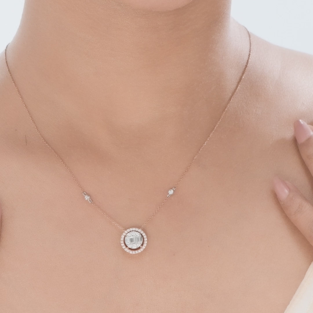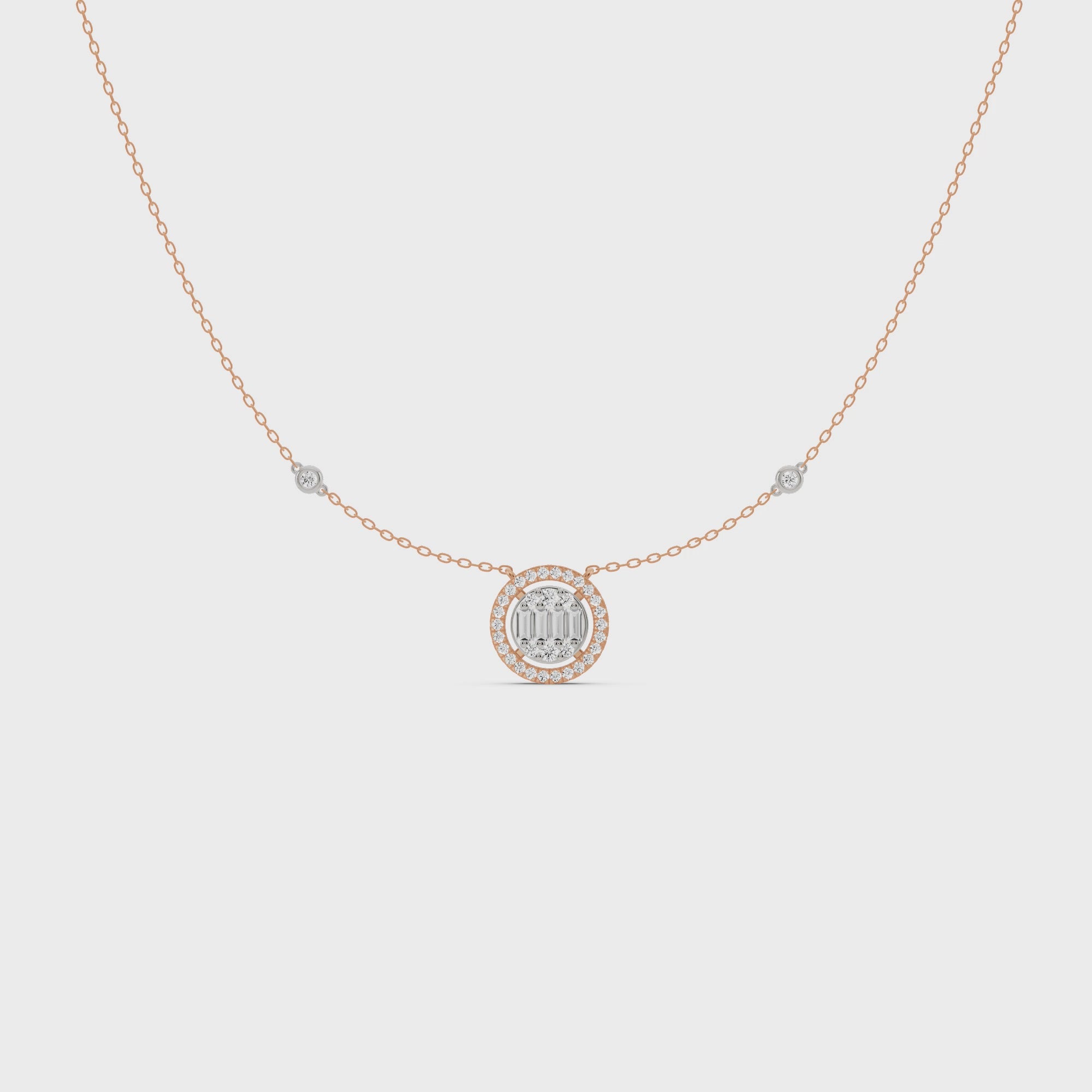 Rose gold diamond pendant from the Facet Fusion Signature Collection, designed with a pavé-set round solitaire, framed by meticulously placed natural diamonds for added brilliance where craftsmanship meets elegance. Set in refined 14KT gold with a total weight of 2.660 grams (2.597 grams net) and adorned with 39 natural diamonds (0.313 carats), these elegant pendants are perfect for evening wear.