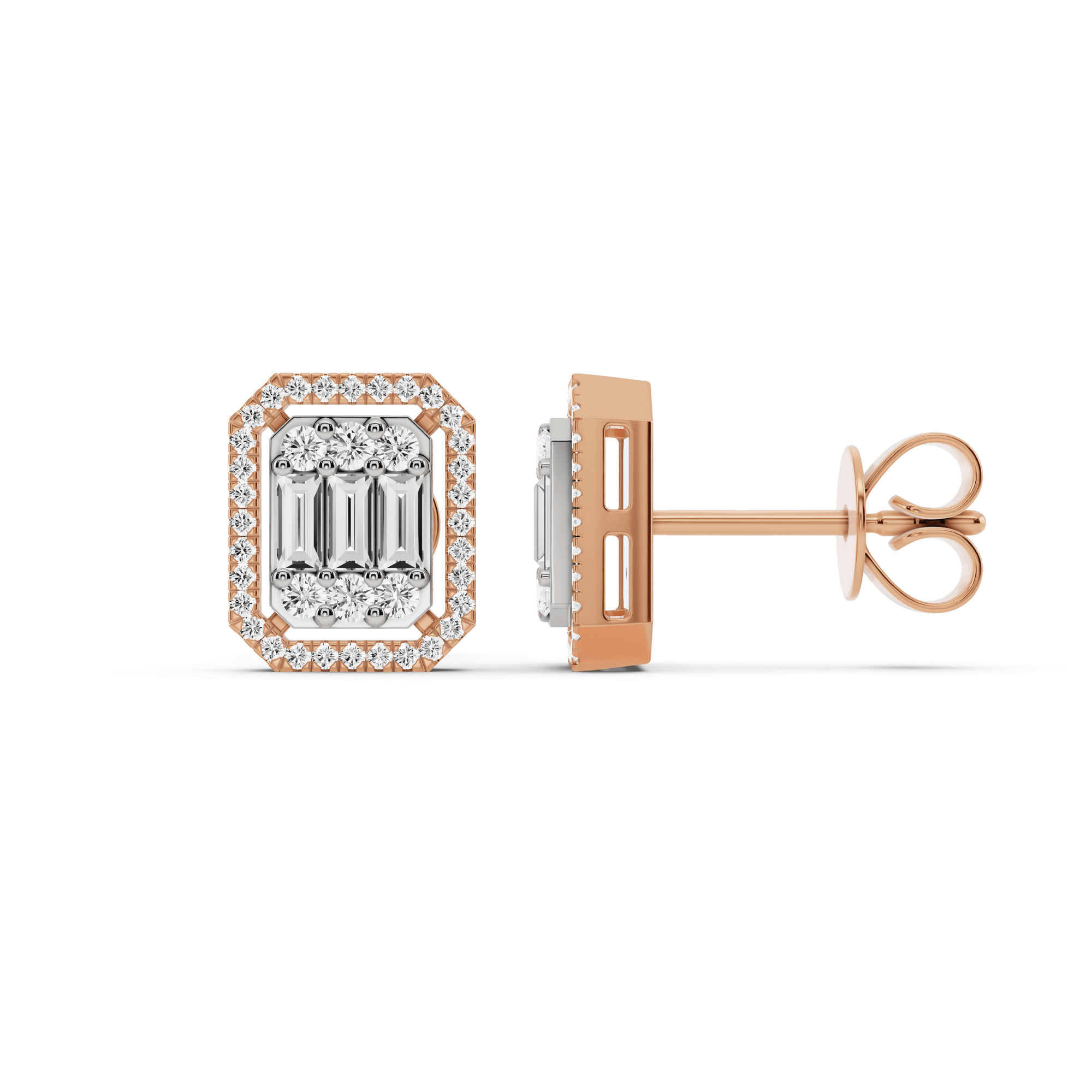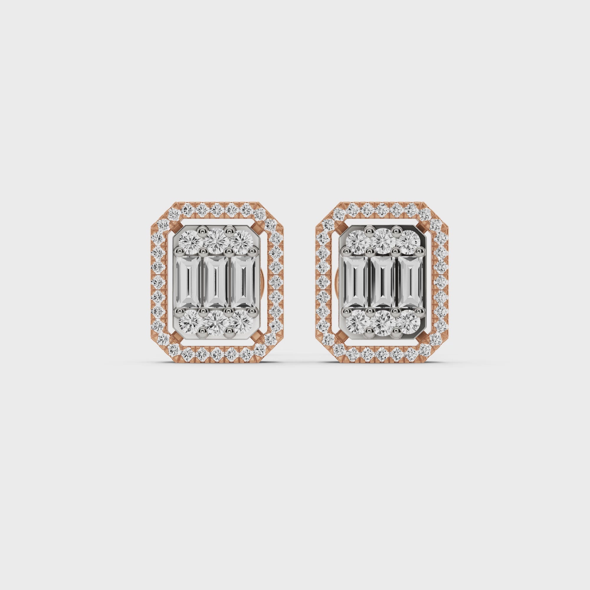 A pair of rose gold diamond earrings from the Facet Fusion Signature Collection, designed with a pavé-set emerald solitaire, framed by meticulously placed natural diamonds for added brilliance where craftsmanship meets elegance. Set in refined 14KT gold with a total weight of 2.650 grams (2.545 grams net) and adorned with 85 natural diamonds (0.523 carats), these elegant earrings are perfect for evening wear.