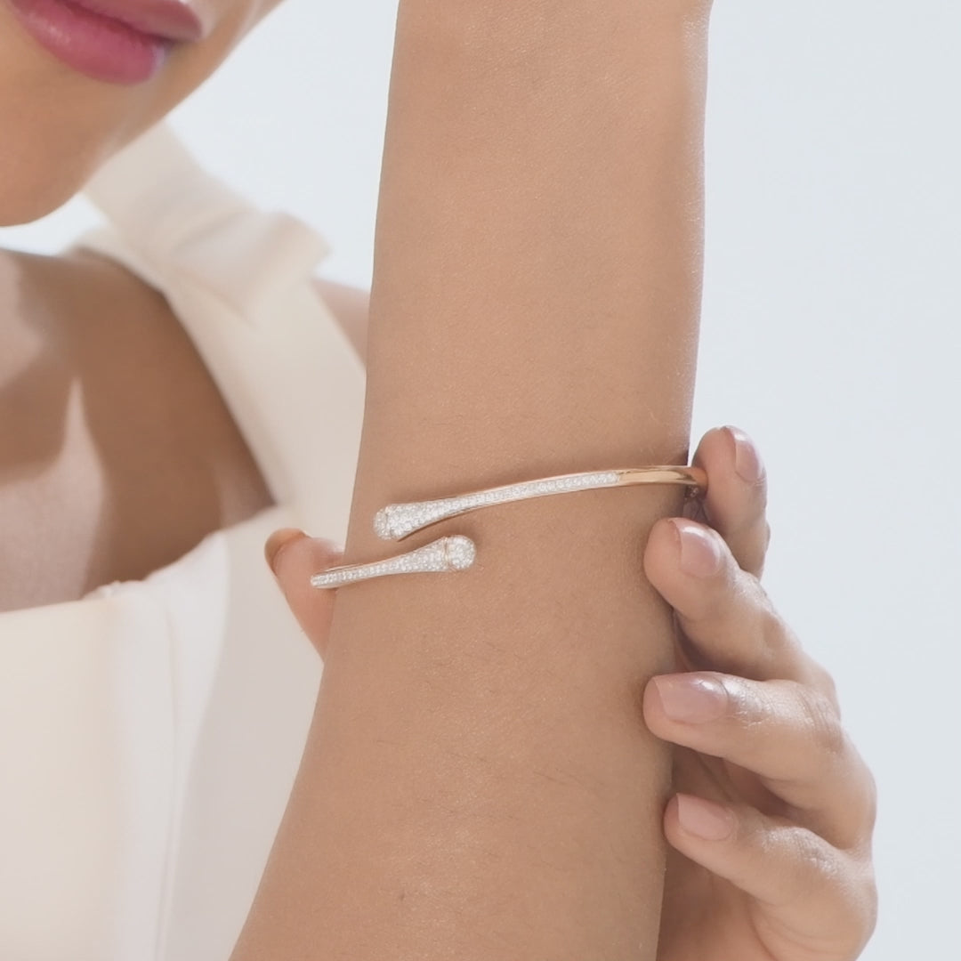 This striking tapered open-cuff features two opposing, cone-like central elements in a warm, rosy-toned metal. The main surfaces, as well as one side of the bangle, are fully paved with brilliant round diamonds. Its bold, modern design makes it a statement piece, perfect for cocktail parties, fashion-forward events, or as an unforgettable anniversary gift.