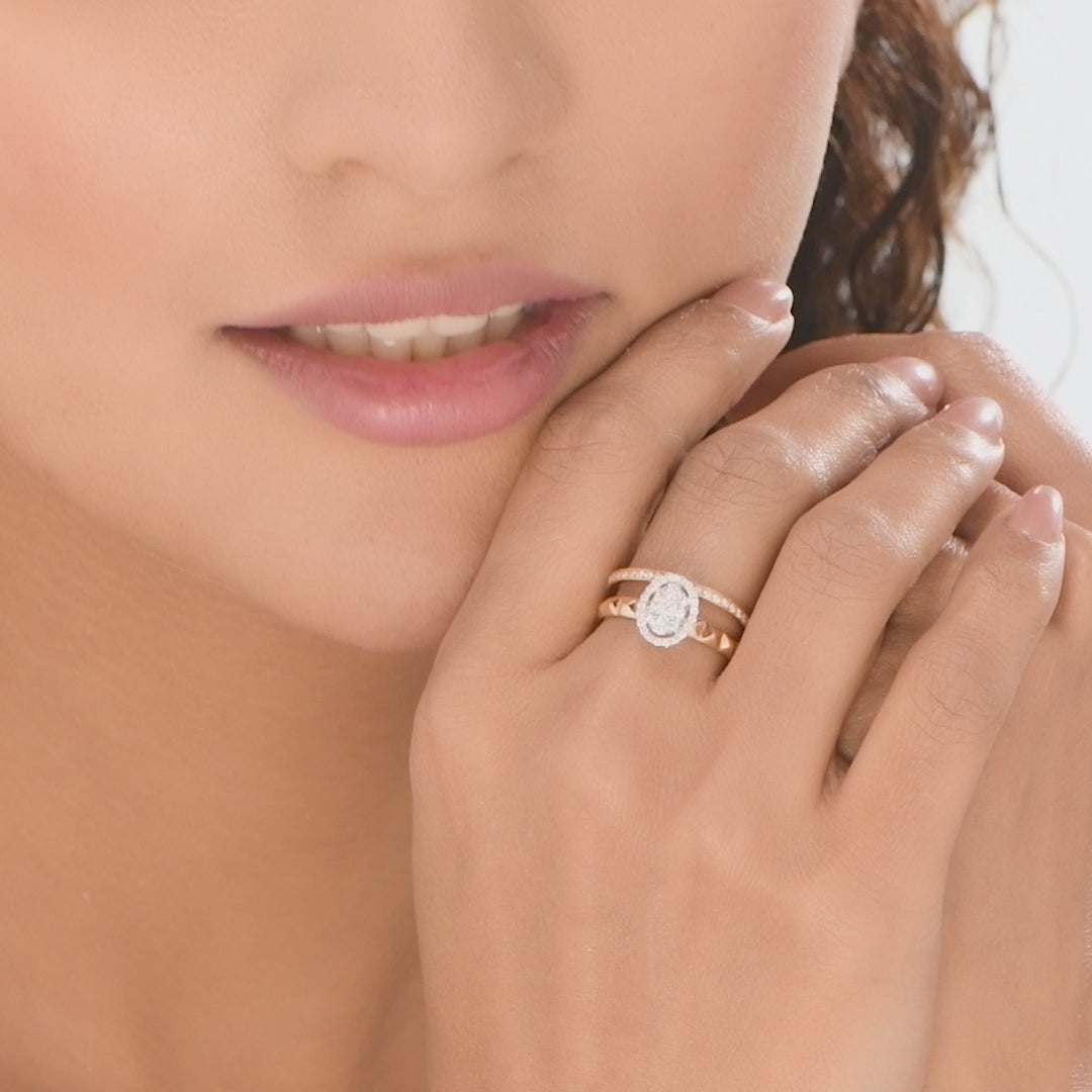 This oval-shaped dual-band ring flaunts a striking halo centerpiece studded with shimmering white diamonds. The blend of geometric and classic design elements adds a modern twist, making it perfect for festive evenings, cocktail parties, or elegant celebrations where glamour takes center stage.