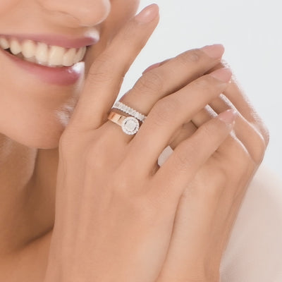 A bold fusion of elegance and edge, this two-band ring showcases a stunning round halo centerpiece lined with baguette and brilliant-cut white stones. The upper band glimmers with a sleek row of baguette stones, creating a chic layered effect. Perfect for cocktail nights, festive gatherings, or upscale celebrations, this ring adds a touch of modern luxury to any look.