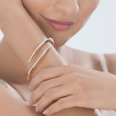 This rosy-toned bangle features two sharply tapered, curved lines forming an open design. Both lines are paved with brilliant round diamonds. Its bold, modern look is perfect for sophisticated cocktail parties or a special anniversary.