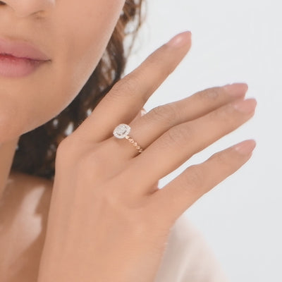 A stunning cushion-shaped cluster ring adorned with radiant white stones, encased in a sparkling halo design. Perfect for evening parties, date nights, or festive celebrations where subtle sophistication meets captivating shine.
