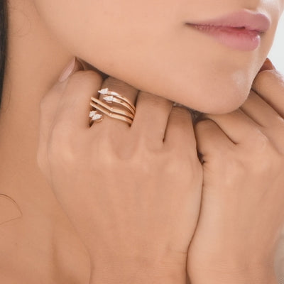 A modern V-shaped ring featuring a graceful layered design accented with pear-shaped white diamonds. Its flowing lines and contemporary silhouette make it a perfect choice for evening soirées, festive celebrations, or elegant dinners — where sophistication meets sparkle.