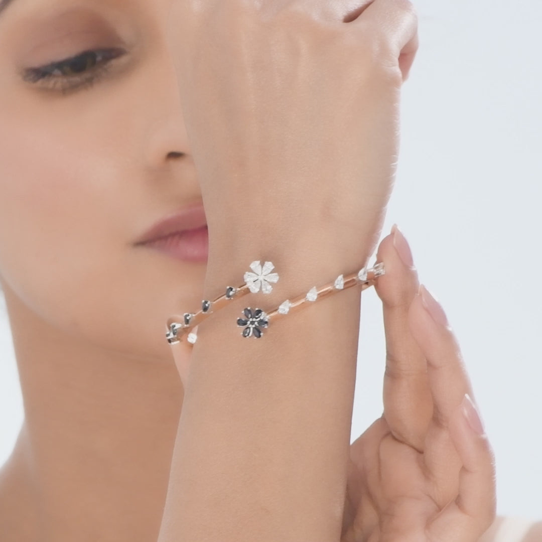 A delicate metal wrap bracelet featuring an open cuff design with two flowersone diamond-pave and one with pear-shaped blue sapphiresplus an alternating trail of sapphire and diamond accents, perfect for a bridal shower or cocktail reception.