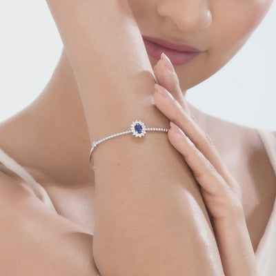 A sleek white metal bracelet featuring a central oval blue sapphire surrounded by a diamond halo design, perfect for adding vibrant elegance to a special occasion or evening event.