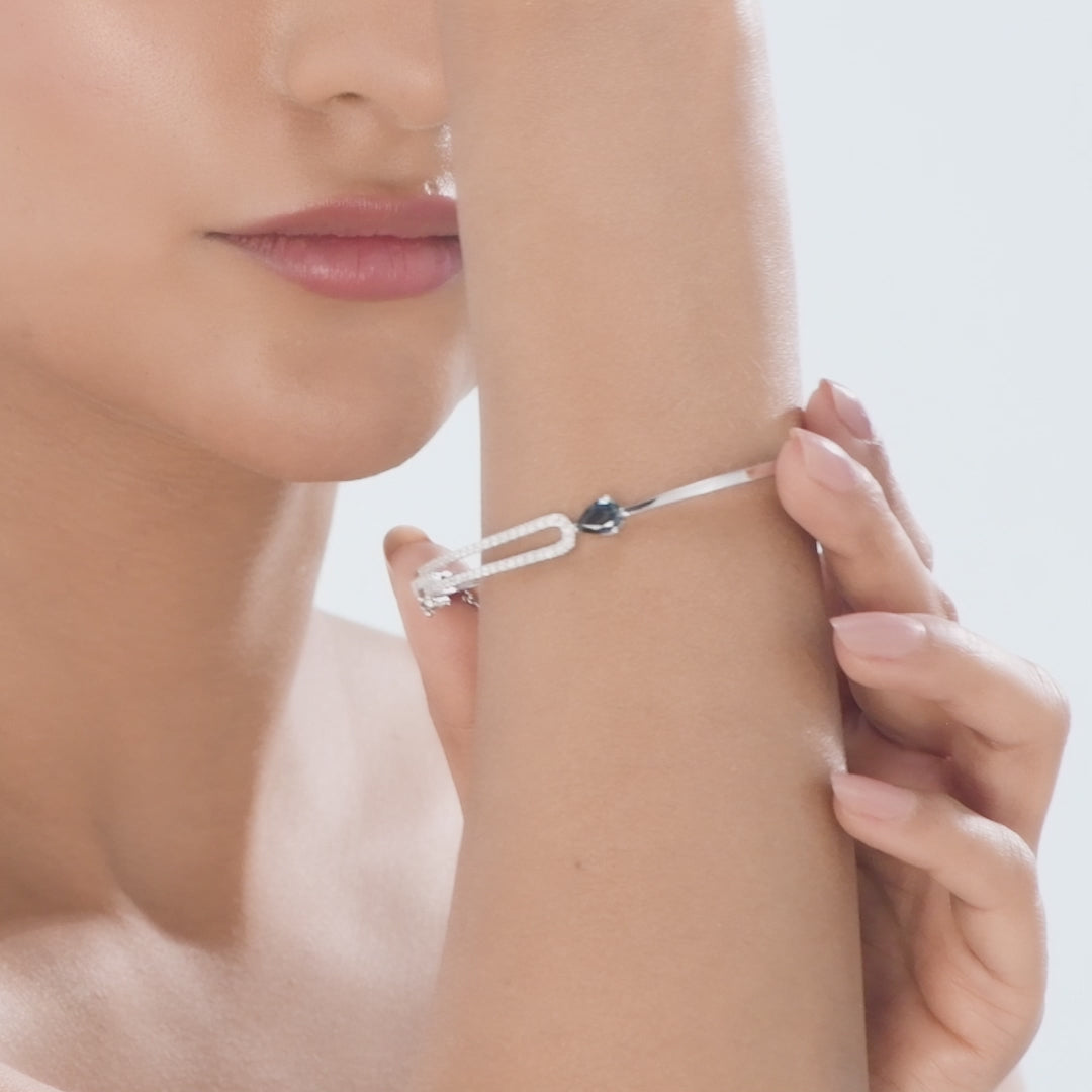 A minimalist white metal bangle featuring an asymmetrical, open-loop design paved with diamonds, culminating in a striking pear-shaped blue sapphire drop, perfect for a high-fashion event or evening reception.