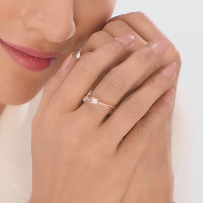 Featuring a Princess-cut diamond set on a unique crossover band design, this contemporary ring uses natural diamonds. Ideal for a Promise Ring or Stylish Daily Wear.