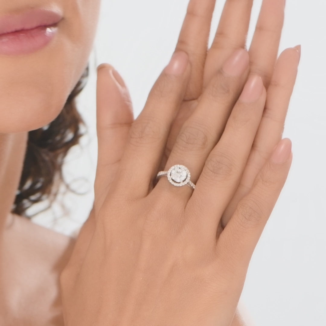 This ring features a large round brilliant center stone , amplified by a tight halo of diamonds, and a band that is paved on the shoulders. It is an ideal piece for an Engagement, a Significant Anniversary, or to wear at a Gala or other Formal Occasions.