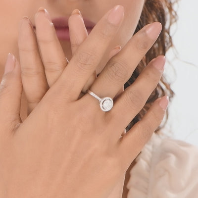 This features a round brilliant center stone weighing 0.90 cts, framed by a dazzling halo and a paved band. Ideal for an Engagement or a Milestone Anniversary and perfect for Formal Occasions.